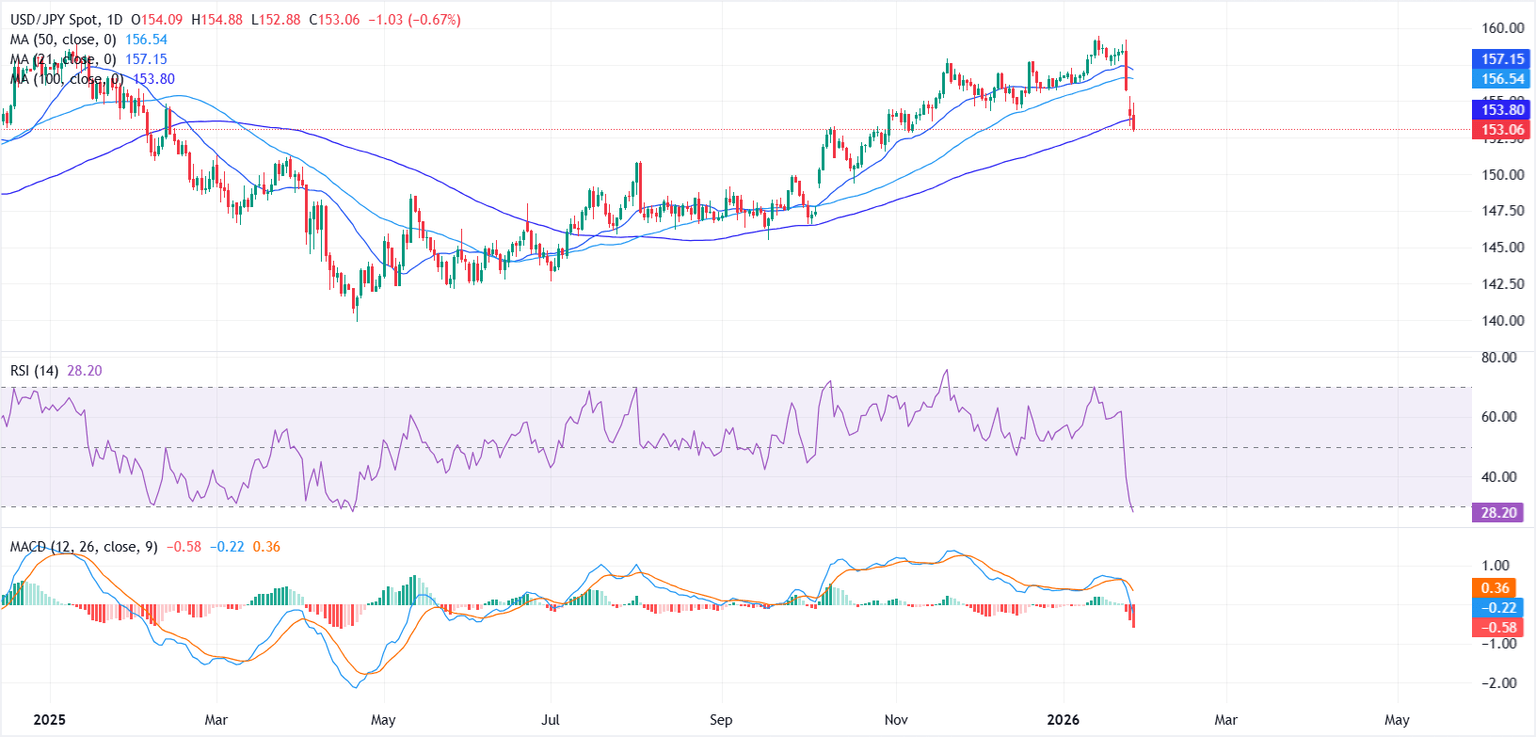 The Japanese Yen (JPY) remains on the front foot against the US Dollar (USD) on Tuesday, with growing intervention risks and broad-based weakness in the Greenback reinforcing downside pressure on the pair. At the time of writing, USD/JPY trades near 153.06, hovering around over two-month lows after last week’s sharp reversal.
