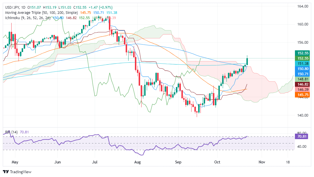 The USD/JPY extended its gains sharply during Wednesday in the North American session, sponsored by the close positive correlation with the US 10-year T-note yield, while traders remain concerned about US elections. At the time of writing, the pair exchanges hands at 152.60, up by more than 1%.