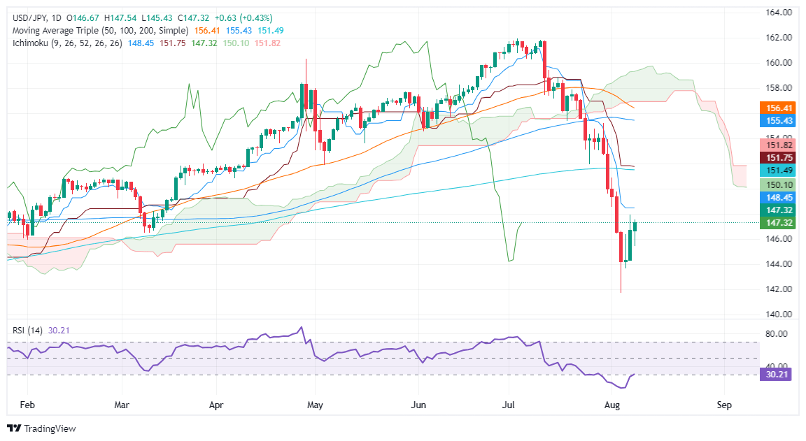 The USD/JPY rises for the third straight session. However, it remains within familiar levels, unable to decisively clear the August 7 daily high at 147.89, after solid US jobs data boosted the Greenback. At the time of writing, the pair trades at 147.28, up 0.38%