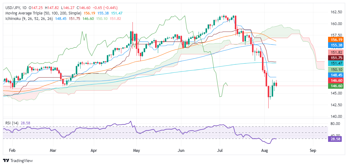 - Below 146.00, key support levels include 145.44, 144.28, and 143.61; above 147.00, resistance targets are 147.89 and 148.45.