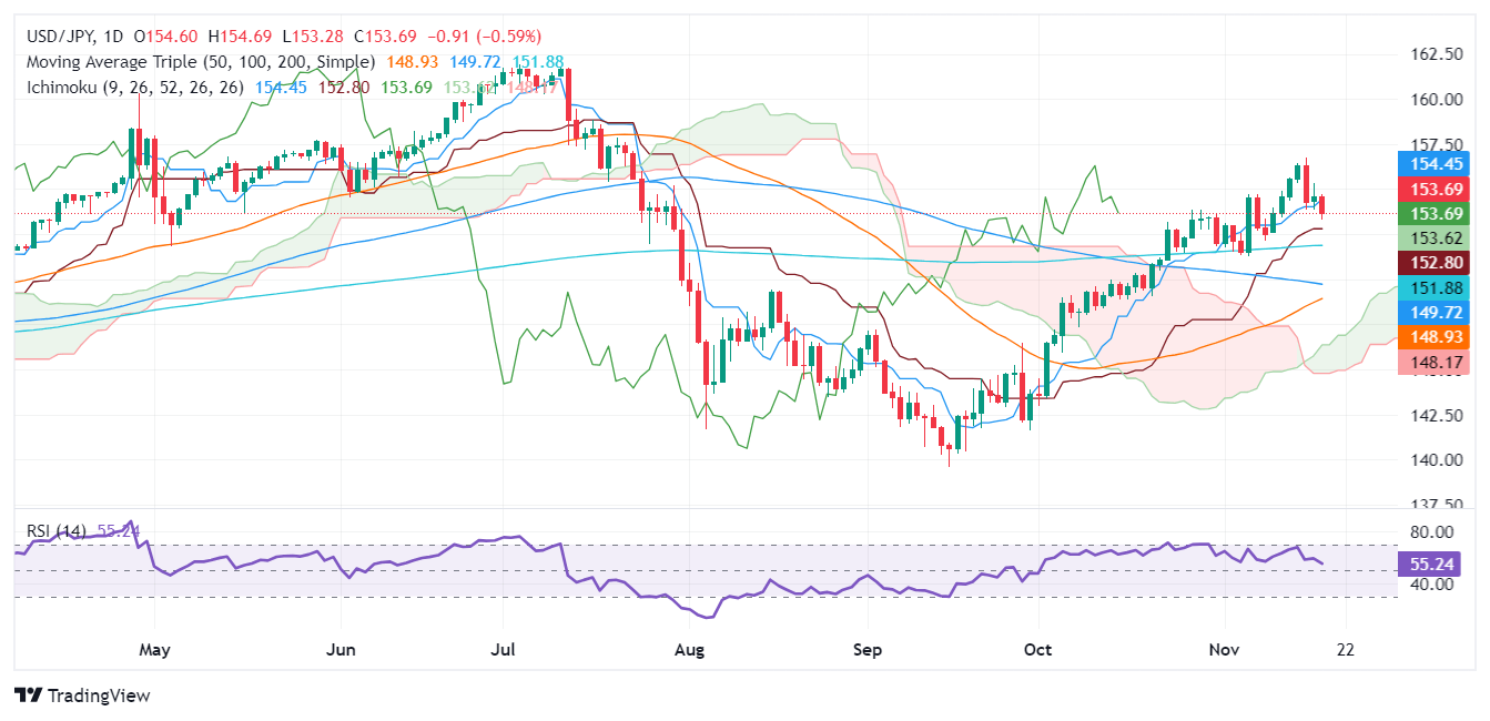 The USD/JPY cleared support at the November 7 high at 154.71, opening the door for further losses. The pair achieved a lower low, falling to a six-day bottom of 153.28, which could pave the way to testing the 200-day Simple Moving Average (SMA) at 151.88.