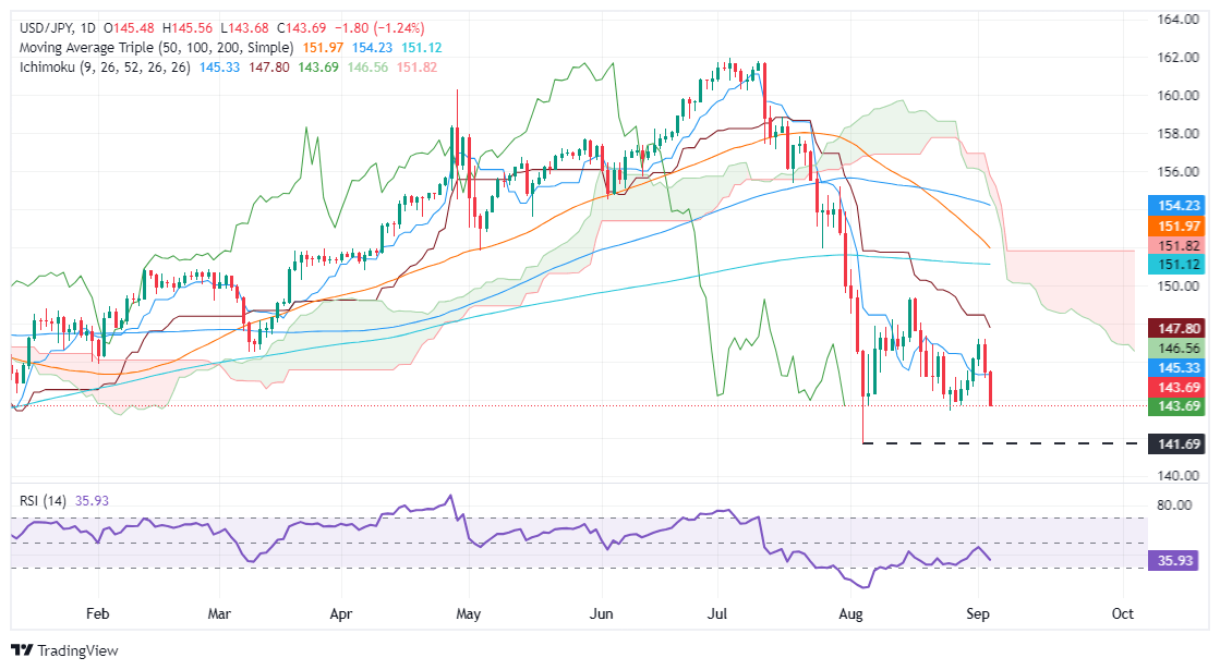 The USD/JPY first support would be the August 26 daily low of 143.45. A breach of the latter would expose key psychological support levels, like the 143.00 mark, followed by the 142.50 and 142.00. Once hurdled, the next stop would be the August 5 low of 141.69.