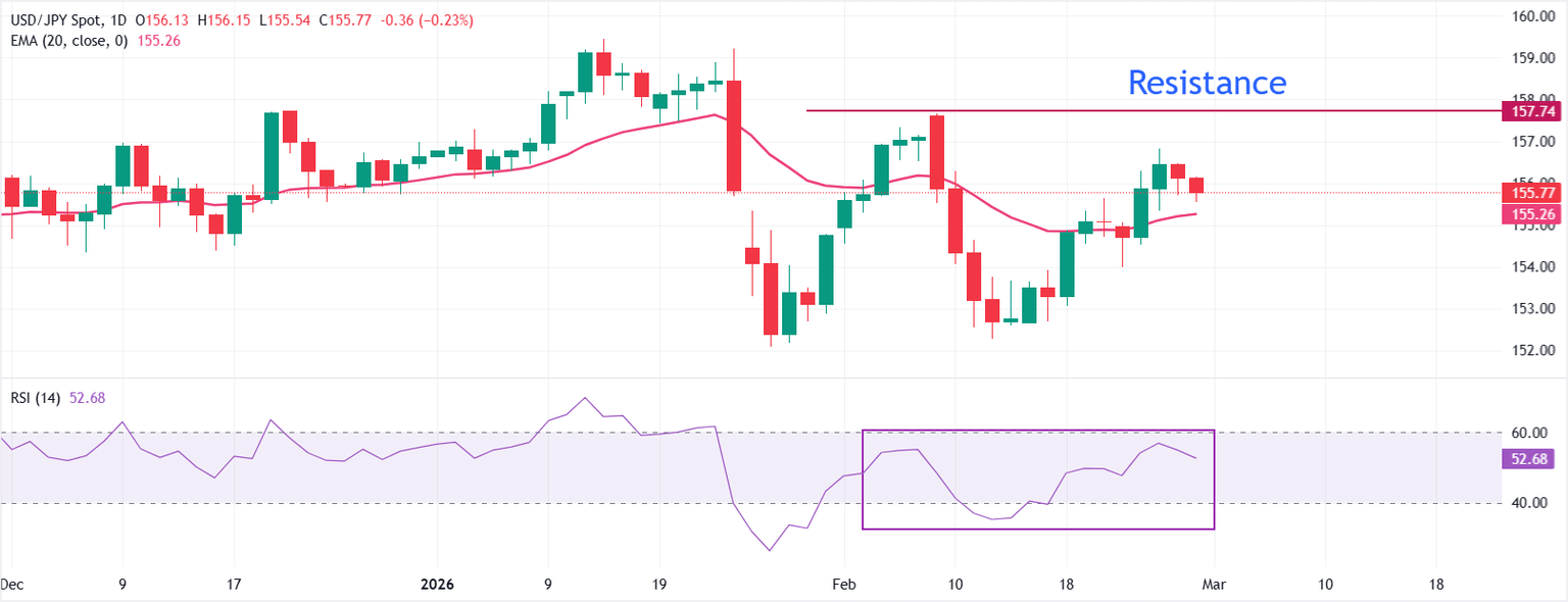 Initial resistance emerges at the February 9 high of 157.66, ahead of the 159.20-159.45 zone that capped the last upswing. On the downside, immediate support stands near 155.20 at the 20-day EMA, followed by the February 23 low around 154.00 and then the recent swing low around 152.27, where a break would undermine the current bullish structure and open a deeper retracement.