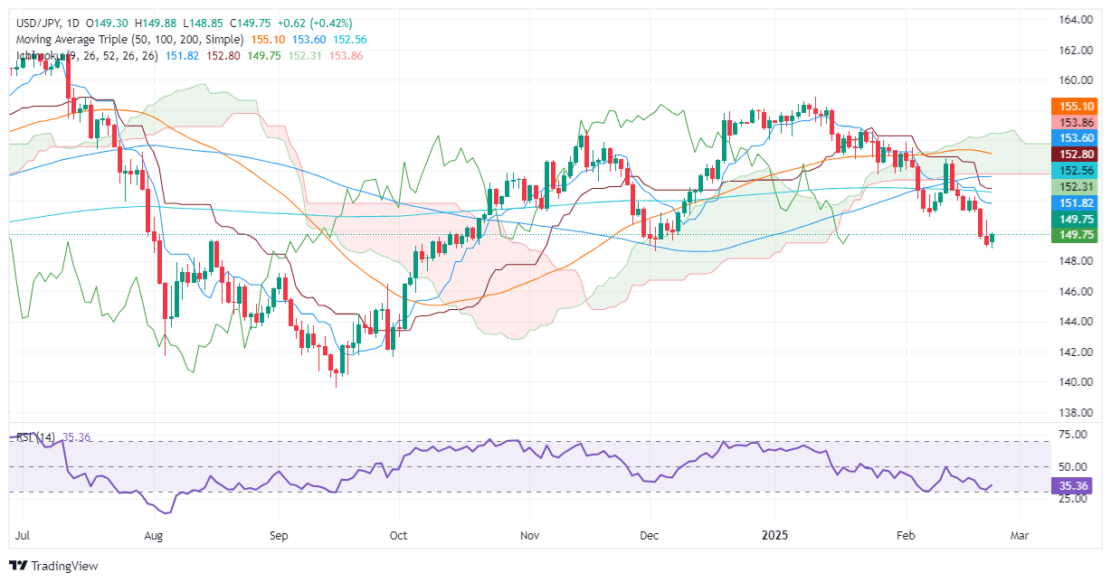 The daily chart depicts the pair as downward biased, with the USD/JPY exchange rate below the 200-day Simple Moving Average (SMA) of 152.57 and beneath the Ichimoku Cloud (Kumo).