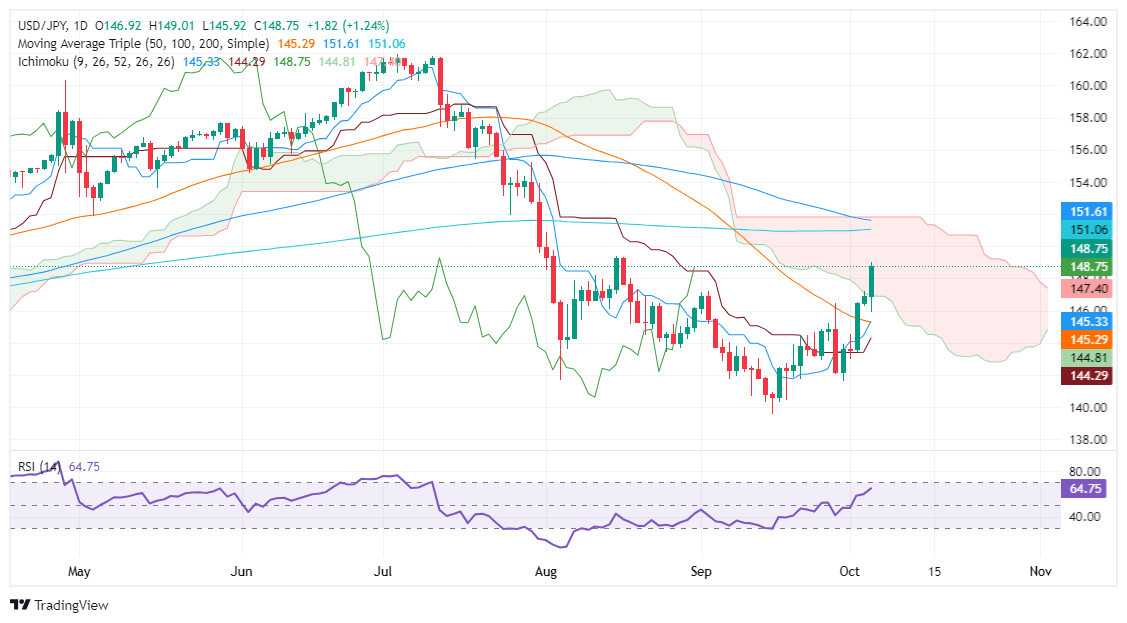 The USD/JPY rallied sharply inside the Ichimoku cloud (Kumo) after the US Bureau of Labor Statistics (BLS) revealed that the latest jobs report added over 254K employees to the workforce. This underpinned US Treasury yields, which lifted the exchange rate to current price levels due to their close correlation with the pair. The major trades at 148.73, up by over 1%.