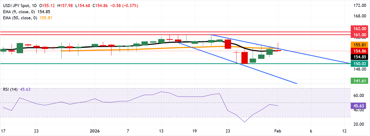 The USD/JPY pair steadies around the nine-day Exponential Moving Average (EMA) and remains capped beneath the 50-day EMA at 155.63. The 50-day EMA has begun to roll over, limiting recovery attempts. A daily close above the 50-day EMA could open room toward resistance, while failure to reclaim the short-term average keeps the tone heavy.