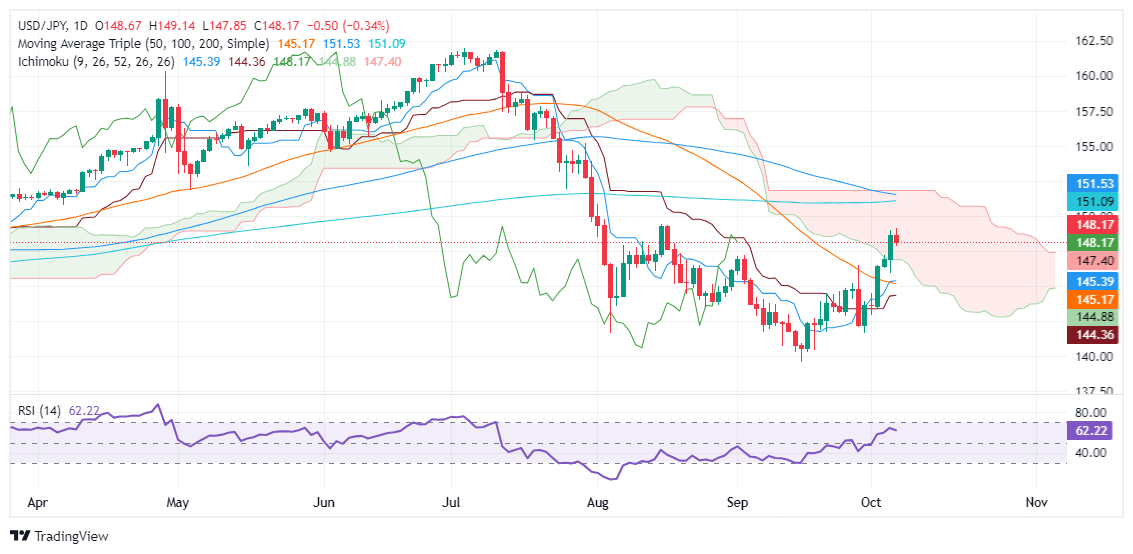 The USD/JPY failed to extend its uptrend after piercing inside the Ichimoku Cloud (Kumo), which opened the door for further upside. Alongside that, the pair cleared the 50-day moving average (DMA) at 145.17, and since then, buyers have set their sights on 150.00.