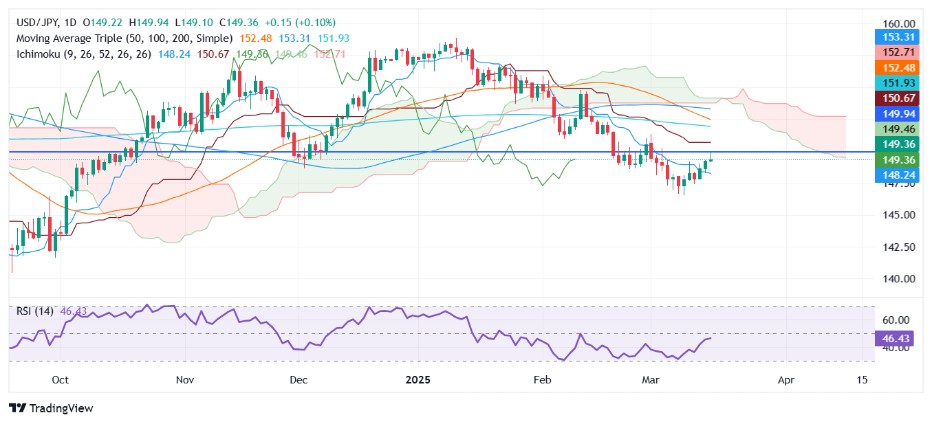 The USD/JPY first support would be the 149.00 figure. A breach of the latter will expose the Tenkan-sen at 148.20, closely followed by the March 14 low of 147.76. Conversely, if buyers push the pair above 150.00, this will expose the Kijun-sen at 150.67 before testing the 200-day Simple Moving Average (SMA) at 151.91.