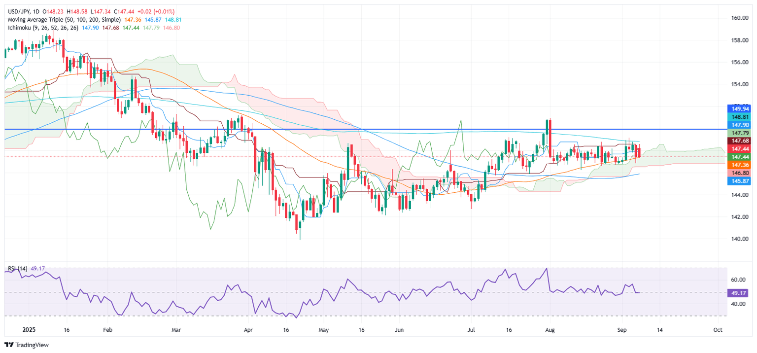 The USD/JPY holds steady below the 147.50 figure yet posts a minuscule loss of 0.02% as traders market participants priced in a Fed rate cut at the September meeting.