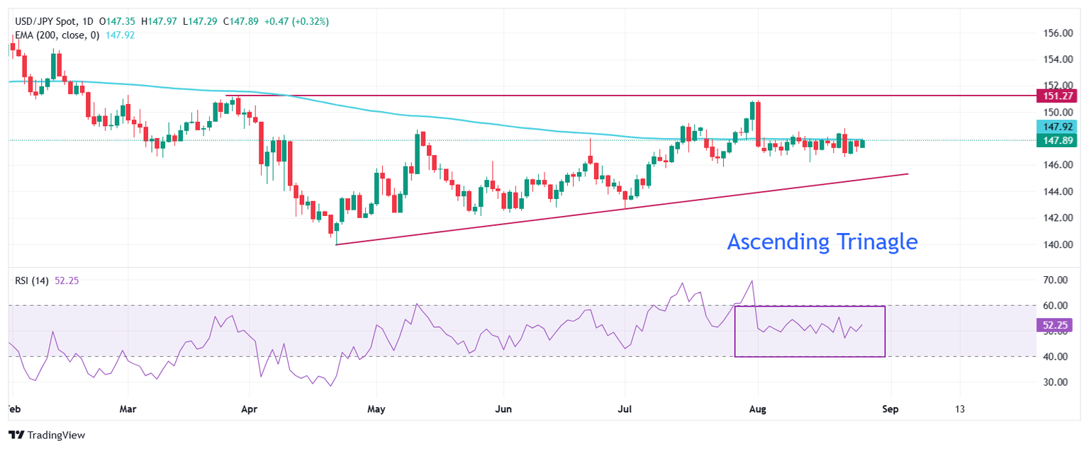 The USD/JPY pair trades 0.4% higher to near 148.00 during the late Asian trading session on Wednesday. The pair advances as the Japanese Yen (JPY) underperforms its peers amid uncertainty surrounding the Tokyo Consumer Price Index (CPI) data for August, which is scheduled to be released on Friday.