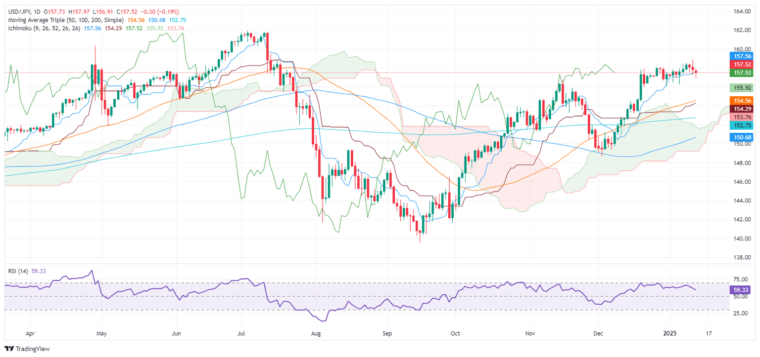 If USD/JPY tumbles below Tenkan-sen, the next support would be the January 6 low of 156.24, followed by the December 31 pivot low of 156.02.