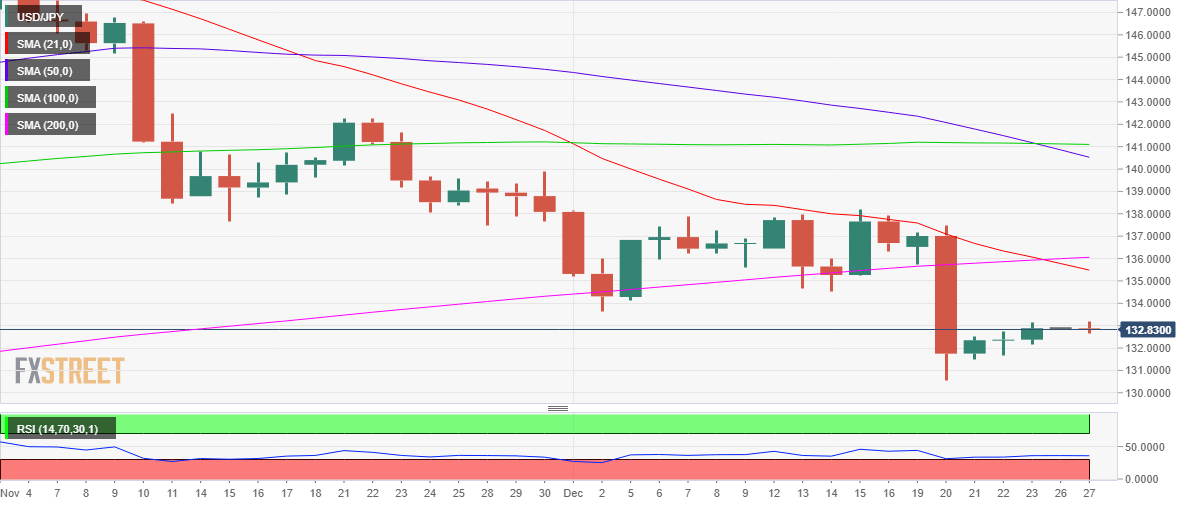 USD/JPY remains depressed below 133.00 amid quiet trading