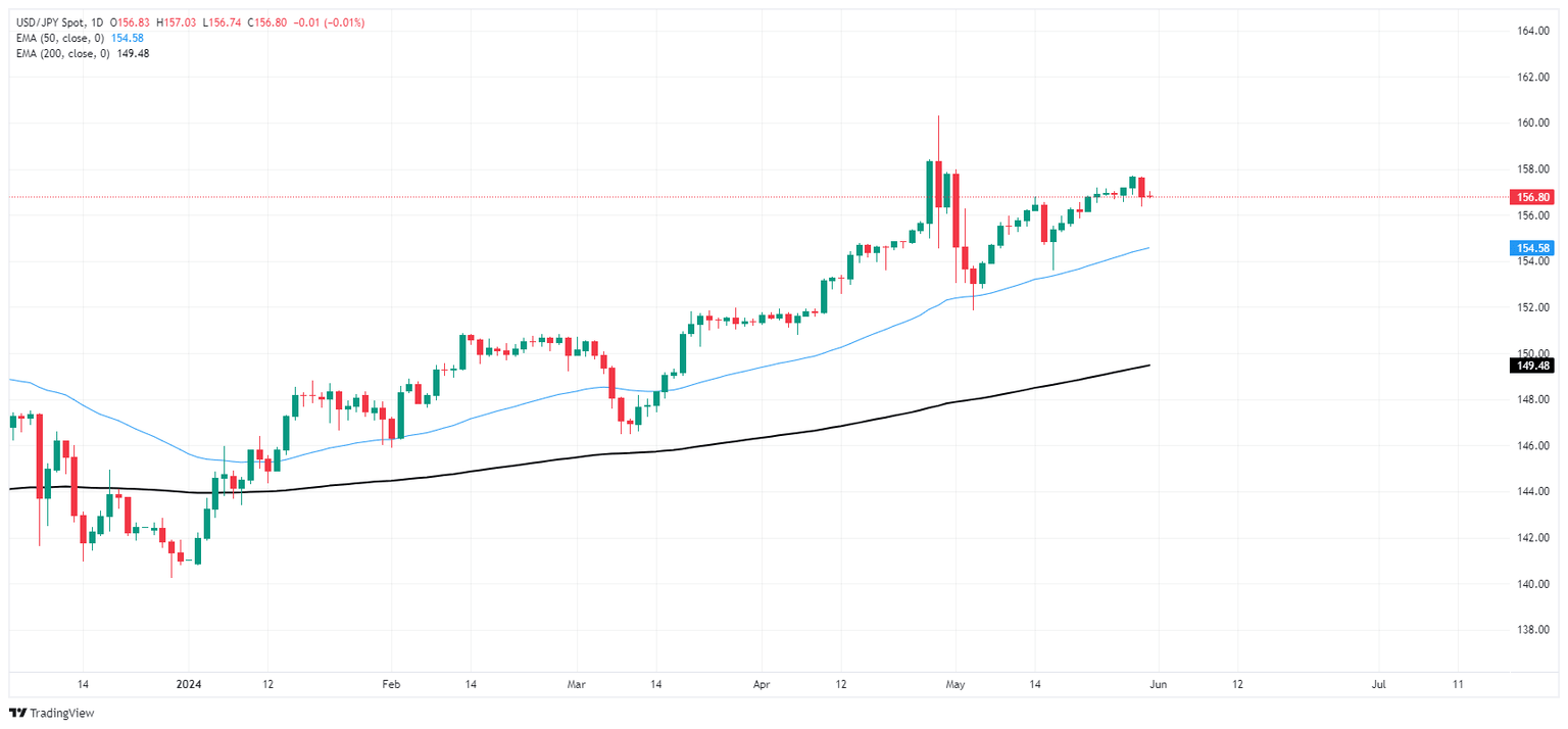 USD/JPY found a quick bump into the 157.00 handle early Friday, but the pair is receding back into familiar congestion near 156.80. The pair has been hamstrung along the 200-hour Exponential Moving Average (EMA) at 156.73 since falling back from this week’s peak near 157.70.