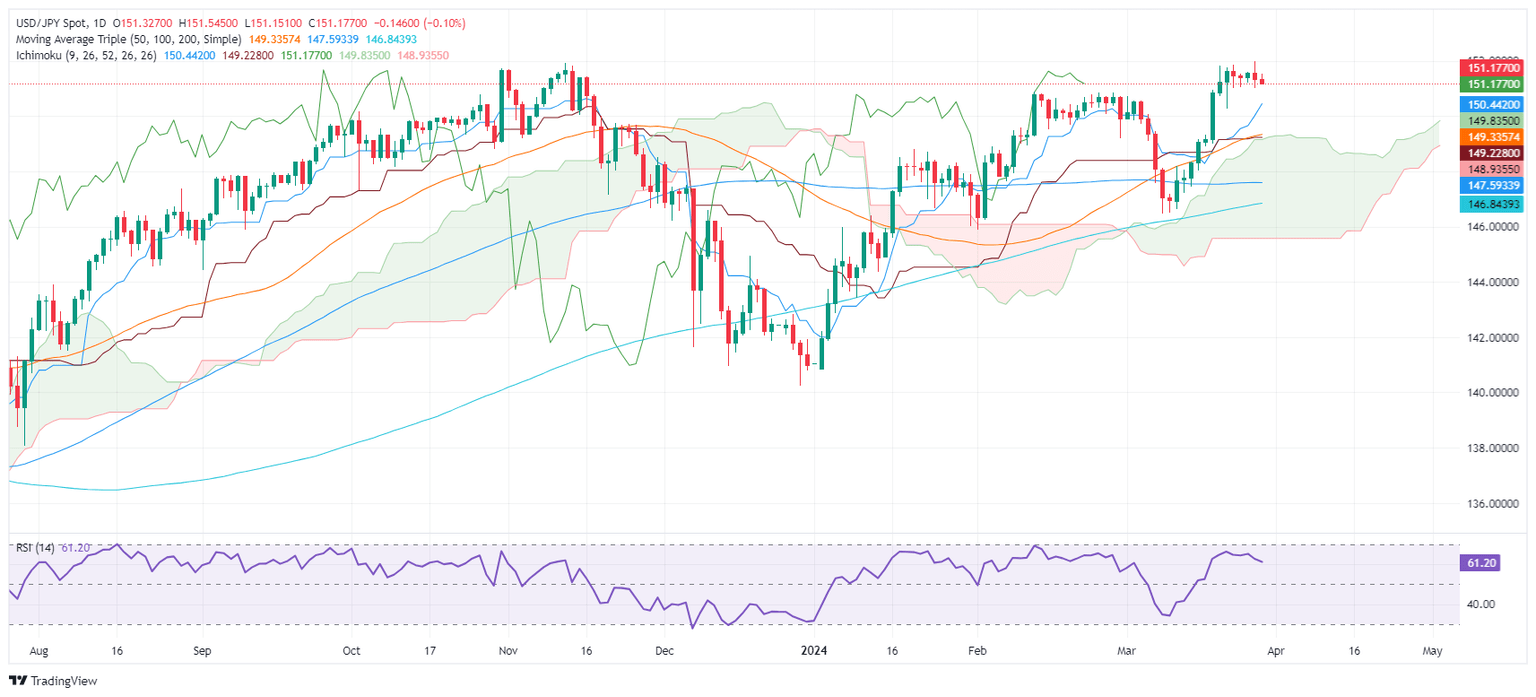 - USD/JPY hovers at 151.28, with traders wary of potential Japanese market intervention to support the Yen.