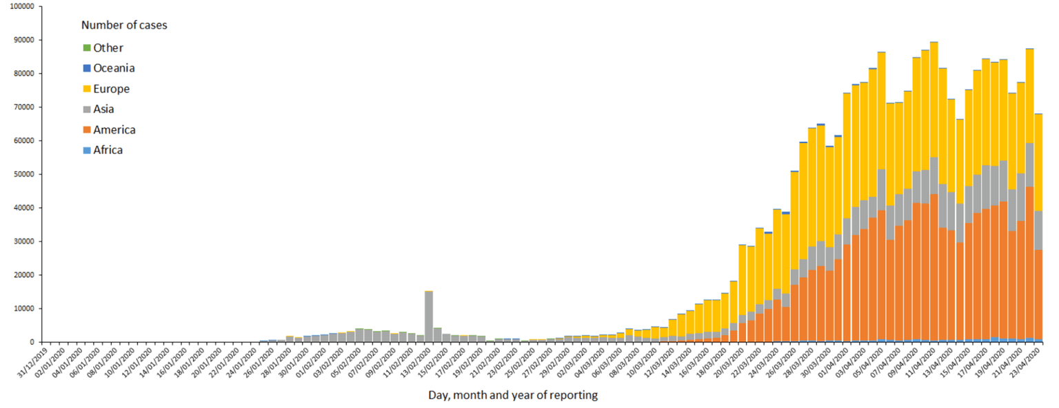 New cases have only risen 2.5% which is the slowest rate this month. Overnight, according to the European Centre for Disease Prevention and Control, since 31 December 2019 and as of 23 April 2020, 2 588 068 cases of COVID-19 (in accordance with the applied case definitions and testing strategies in the affected countries) have been reported, including 182 808 deaths.