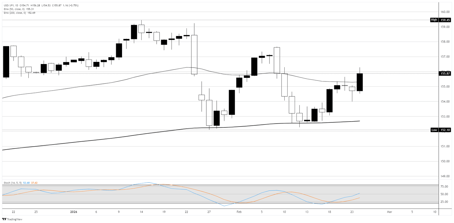 The pair reclaimed the 50-day Exponential Moving Average (EMA) near 155.30 on Tuesday's rally, while the 200-day EMA around 152.70 continues to rise and provided a floor during the early-February pullback toward the 152.100 low. The Stochastic Oscillator has crossed bullish and is drifting higher through neutral territory, suggesting upside momentum is rebuilding after the recent pullback from the January highs close to 159.450. A sustained push above the 157.00 area would open a path toward the 158.000 round number, while a failure to hold above the 50-day EMA would shift focus back toward the 153.00 zone and the 200-day EMA.