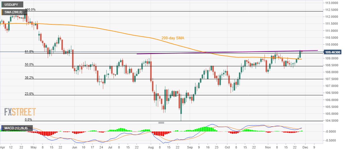 The USD/JPY pair pulls back to 109.45 at press time, with an upward sloping resistance line stopping it from extending its 61.8% Fibonacci retracement breakout. The quote pulls back to 109.45 by the press time of early Thursday.