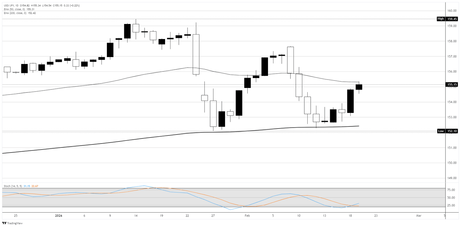 On the daily chart, USD/JPY stuck close 155.00 on Thursday, sitting just below the flattening 50-day Exponential Moving Average (EMA) at 155.30 after rebounding from the 152.10 year-to-date low printed earlier this month. The 200-day EMA at 152.42 continues to trend well below, so the longer-term bullish structure from the late 2025 lows is still valid, but the pair has been trading in a choppy 152.00 to 158.00 range since mid-January. The sharp sell-off from the 159.45 high to the 152.10 low retraced most of the January rally, and the pair is now contesting the 50-day EMA as a pivot level. The Stochastic Oscillator is approaching the oversold zone after crossing bearish, suggesting near-term downside pressure, though a bounce from this area would be consistent with the broader range-trading pattern. Recent sessions show alternating bullish and bearish candles with expanding bodies, pointing to two-way volatility around the 155.00 level. Resistance sits at 156.00 and the 158.00 area; a sustained break above the 50-day EMA would target the upper end of the range. Support rests at 153.00 and the 200-day EMA near 152.42, with the 152.10 low below.