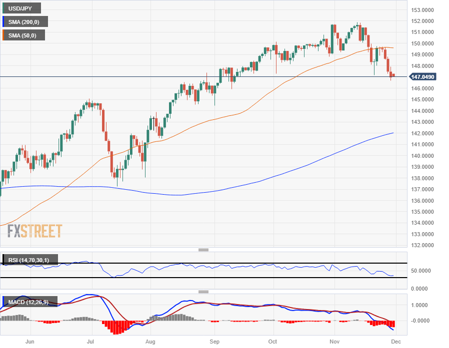 The USD/JPY's downside on Wednesday sees the pair close in the red for a fifth straight day, and the pair is continuing to drift lower after seeing a technical rejection from the 50-day Simple Moving Average (SMA) in the last swing high into 149.50.