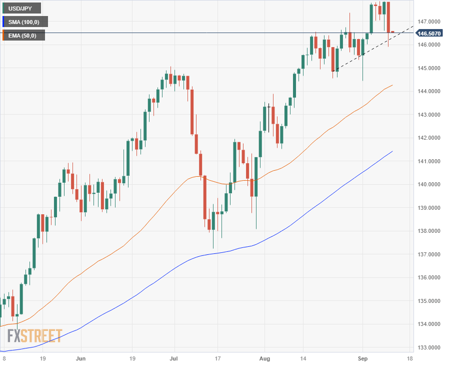 The USD/JPY saw declines in one of the worst-closing trading days since July, finishing Monday near 146.50 after opening the new trading week on the high side near 147.85. The Japanese Yen (JPY) is seeing fresh bidding in the market on the back of bullish comments from the Bank of Japan (BoJ), and the Greenback (USD) is sliding across the board as profit-taking from the recent bull run saps momentum for the US Dollar.