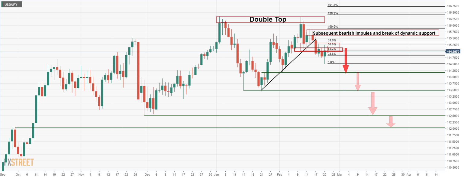 The above analysis illustrates the bearish bias given the series of bearish events in price action since the double top was accompanied by a bearish engulfing close on Feb. 11. We have since seen a break of the trendline support and retests back into the cluster of offers below 115.30.