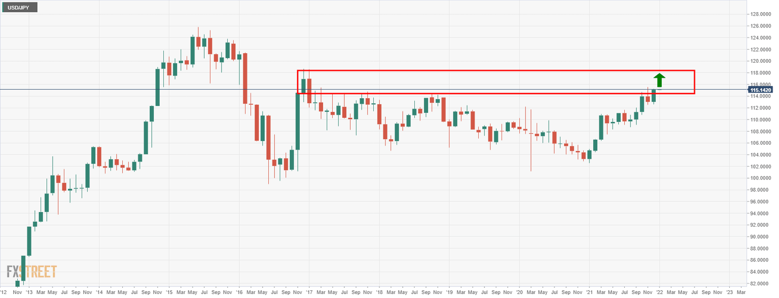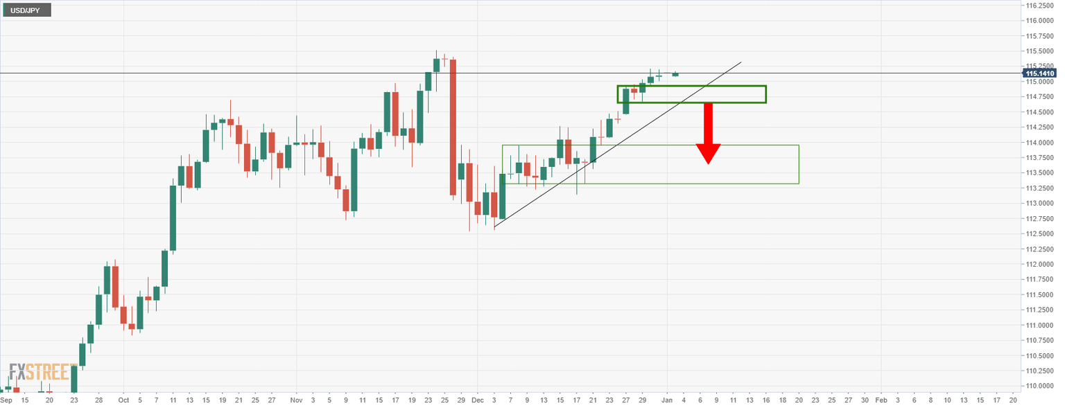 USD/JPY has enjoyed a decent spell on the bid into the end of the year, rising from a low of 112.53 near the start of December and potentially climaxing around the current levels near 115.15. However, on a break of 115.53, the bulls could be encouraged to target 118.50 for weeks ahead as illustrated below.