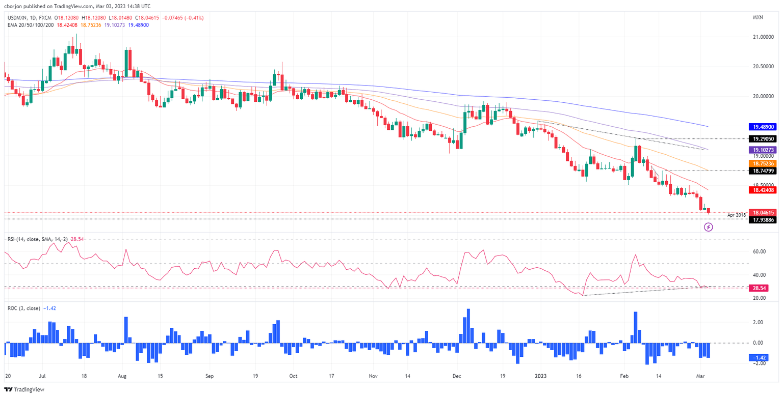 The Mexican Peso (MXN) appreciates against the US Dollar (USD), as the USD/MXN falls to multi-year lows last seen in April 2018 at 18.0148, despite Banxico (Mexican Central Bank) cutting the growth forecast for Mexico in 2023 and 2024. At the time of writing, the USD/MXN exchanges hand at 18.0479, with losses of 0.39%.