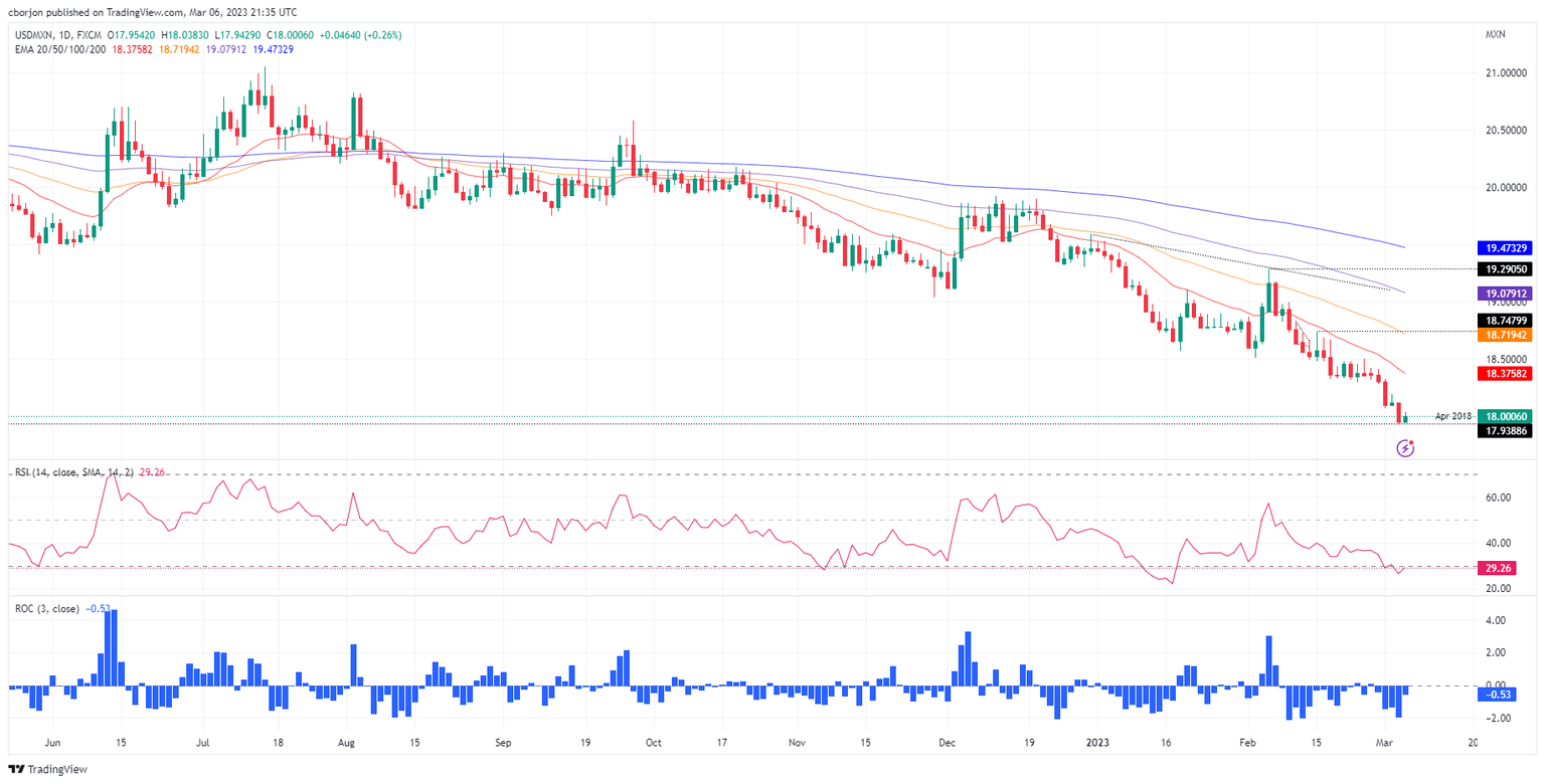 - USD/MXN Price Analysis: Downward biased, but it would need a daily close below $18.00 to expose 6-year lows.