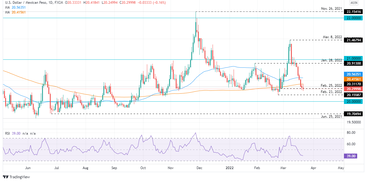 Upwards, the USD/MXN first resistance would be the 200-DMA at 20.4155. Breach of the latter would expose the 50-DMA at 20.5634, followed by the January 28 cycle high at 20.9130, short of the 21.00 barrier. On the flip side, the USD/MXN first support would be February 23 daily low at 20.1558, followed by the psychological 20.00 barrier and June 25, 2021 low at 19.7050.