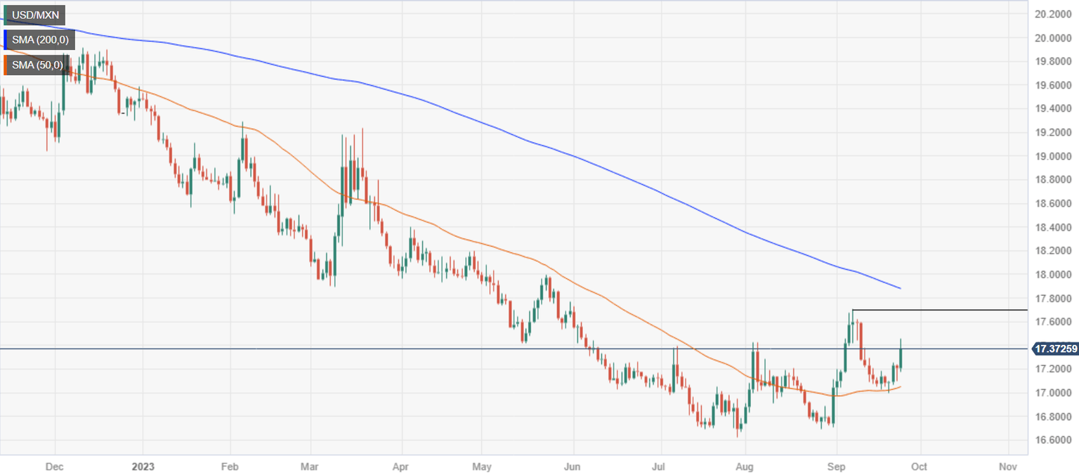 The Mexican Peso (MXN) loses territory against the US Dollar (USD) on Monday, as the last week of Q3 starts with risk-aversion. A strong US Dollar due to higher US bond yields, worries about China’s property sector, and falling commodity prices are the reasons that weakened the MXN. The USD/MXN is trading at 17.3762 after hitting a daily low of 17.1704.