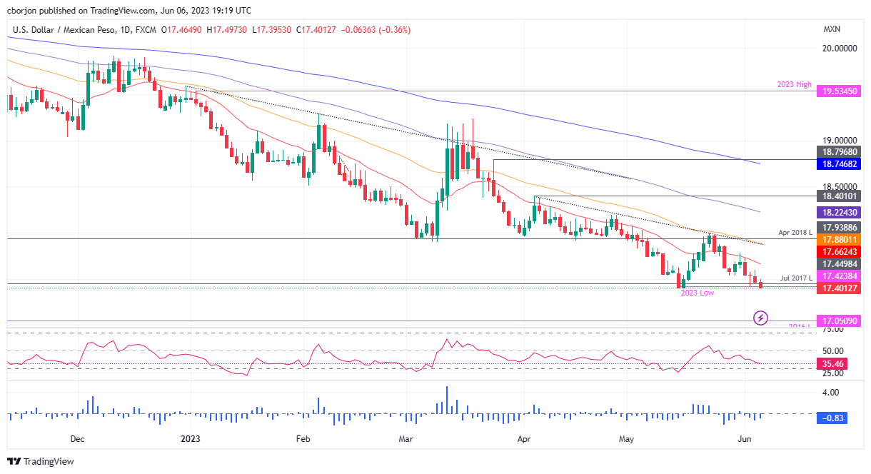 The Mexican Peso (MXN) achieved another multi-year high against the US Dollar (USD), as the USD/MXN pair tumbled past the previous year-to-date (YTD) low of 17.4038 and dived toward 17.3993 before reversing its course toward the 17.40 area. An absent US economic docket keeps traders looking forward to the upcoming Federal Reserve meeting and leaning on the market mood. The USD/MXN is trading at 17.4009, down 0.37%.