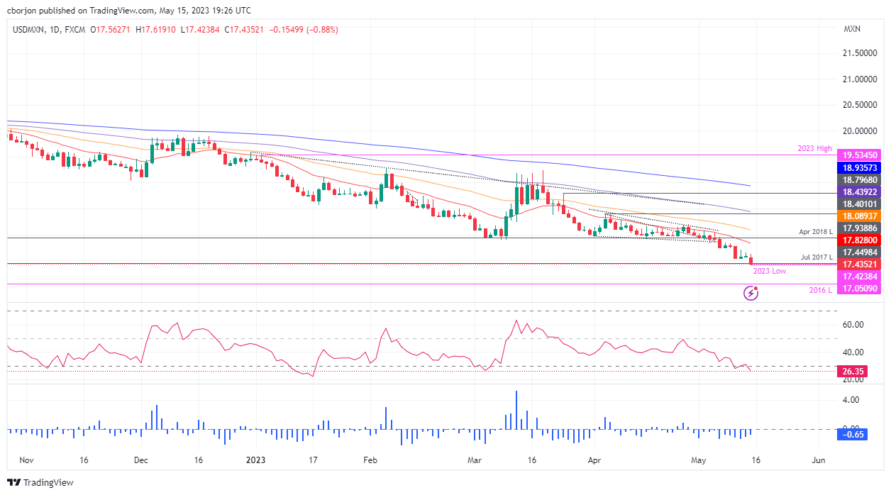 USD/MXN prolongs its fall as the Mexican Peso (MXN) continues to strengthen, with the USD/MXN falling to a new seven-year low at around 17.4339, surpassing the July 2017 low of 17.4498, amidst a risk-on impulse that keeps most US equities on the green. The safety status of the US Dollar (USD), has been compromised, as a light US economic agenda, would leave investors leaning on market sentiment, and central bank speaking. At the time of writing, the USD/MXN is trading at 17.4424, down by 0.80%.