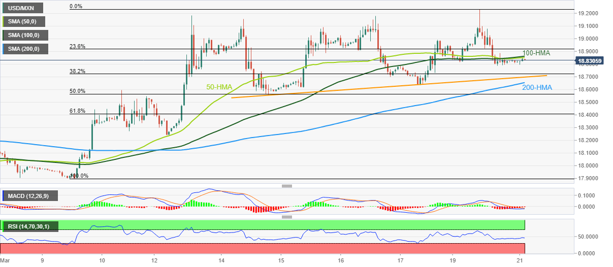 USD/MXN consolidates the previous day’s losses from a 1.5-month high during a sluggish Tuesday morning as Mexican Peso traders celebrate Benito Juarez's Birthday. That said, the pair remains mildly bid near 18.84 by the press time.