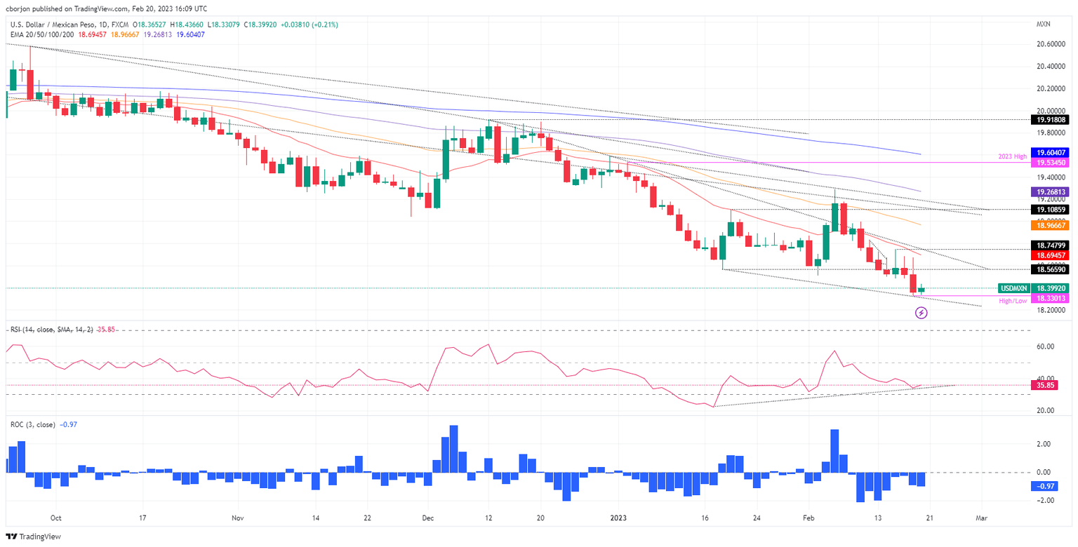 The USD/MXN bounces after hitting multi-year lows around 18.3301, snapping three days of consecutive losses. Nevertheless, the USD/MXN would remain pressured after a strong downtrend dragged prices from the last year's $21.05 peak toward the above-mentioned $18.33 area. At the time of writing, the USD/MXN exchanges hand at 18.4076, above its opening price by 0.25%.