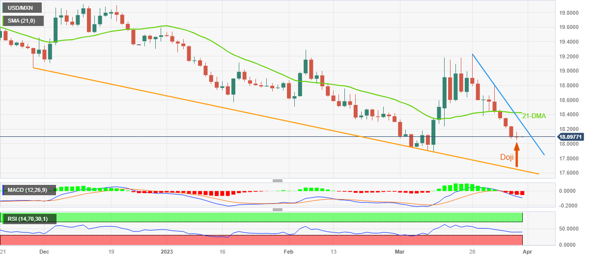 USD/MXN licks its wounds near 18.10, after refreshing the three-week low, during early Friday. In doing so, the Mexican Peso pair probes the five-day losing streak after posting a trend reversal suggesting a candlestick, namely Doji, the previous day.