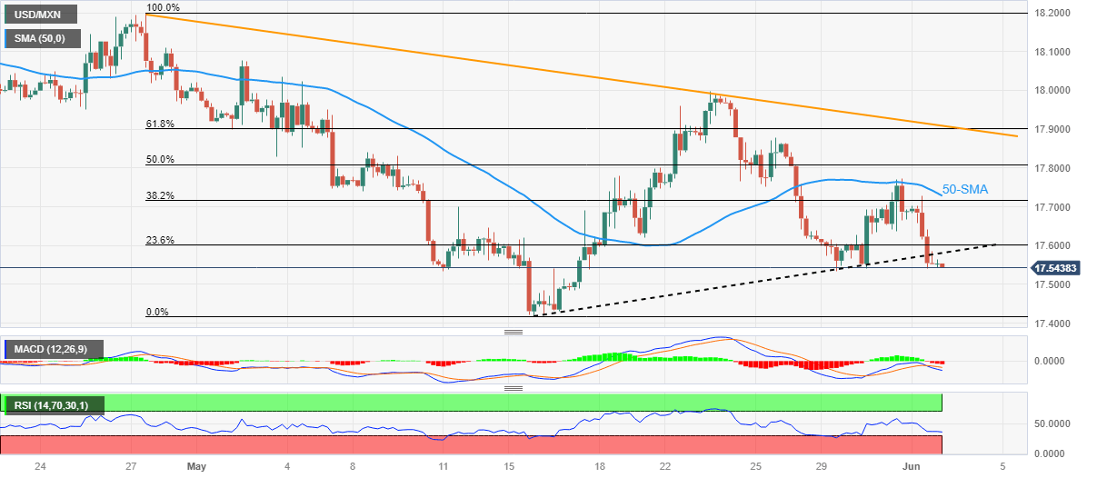 USD/MXN prods intraday low near 17.54 as it run the previous day’s bearish play despite a limited audience on early Friday. In doing so, the Mexican Peso (MXN) pair extends the mid-week reversal from the 50-SMA, as well as the downside break of a two-week-old rising trend line.