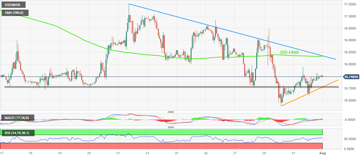 However, a convergence of the 200-Hour Simple Moving Average (HMA) and a downward-sloping trend line from July 21, close to 16.83 by the press time, appears a tough nut to crack for the USD/MXN bulls.