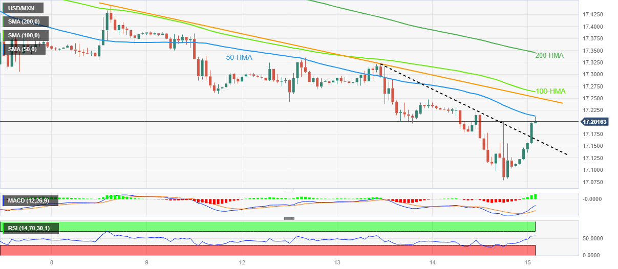 USD/MXN grinds near intraday high of around 17.20 as it prod the 50-Hour Moving Average (HMA) during the first positive day in three on early Thursday. In doing so, the Mexican Peso (MXN) pair defends the late Wednesday’s rebound from the lowest levels since 2016.