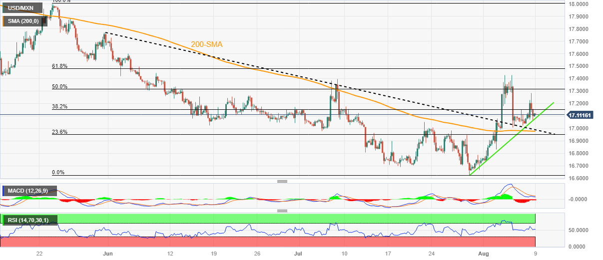 USD/MXN clings to mild gains around 17.11 as it defends late Tuesday’s corrective bounce off a one-week-long rising support line amid a sluggish start to Wednesday’s trading. In doing so, the Mexican Peso (MXN) justifies the market’s cautious mood ahead of Mexico’s headline inflation numbers for July, scheduled for release at noon per the GMT today.