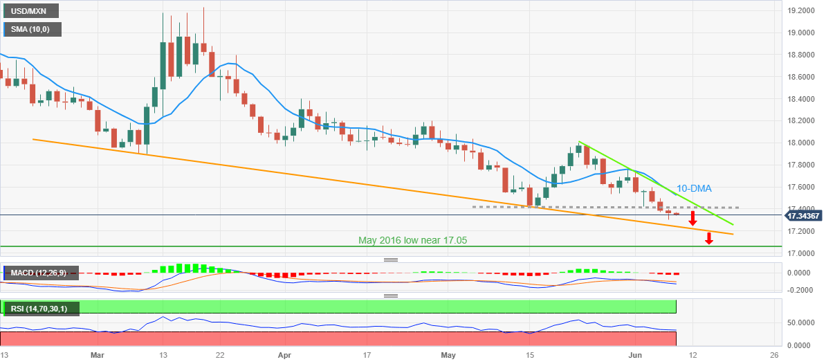 USD/MXN takes offers to refresh the intraday low near 17.34 during the early hours of Thursday’s European session. In doing so, the Mexican Peso (MXN) pair fades late Wednesday’s corrective bounce off the lowest levels since May 2016 while printing a four-day losing streak.