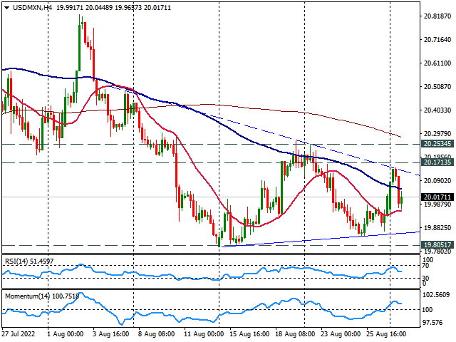 The USD/MXN is flat on Monday as it pulled back after reaching the highest level in almost a week at 20.16. The pair tested a critical resistance area around 20.17, the convergence of a short-term downtrend line and the 20 and 200-day Simple Moving Average.