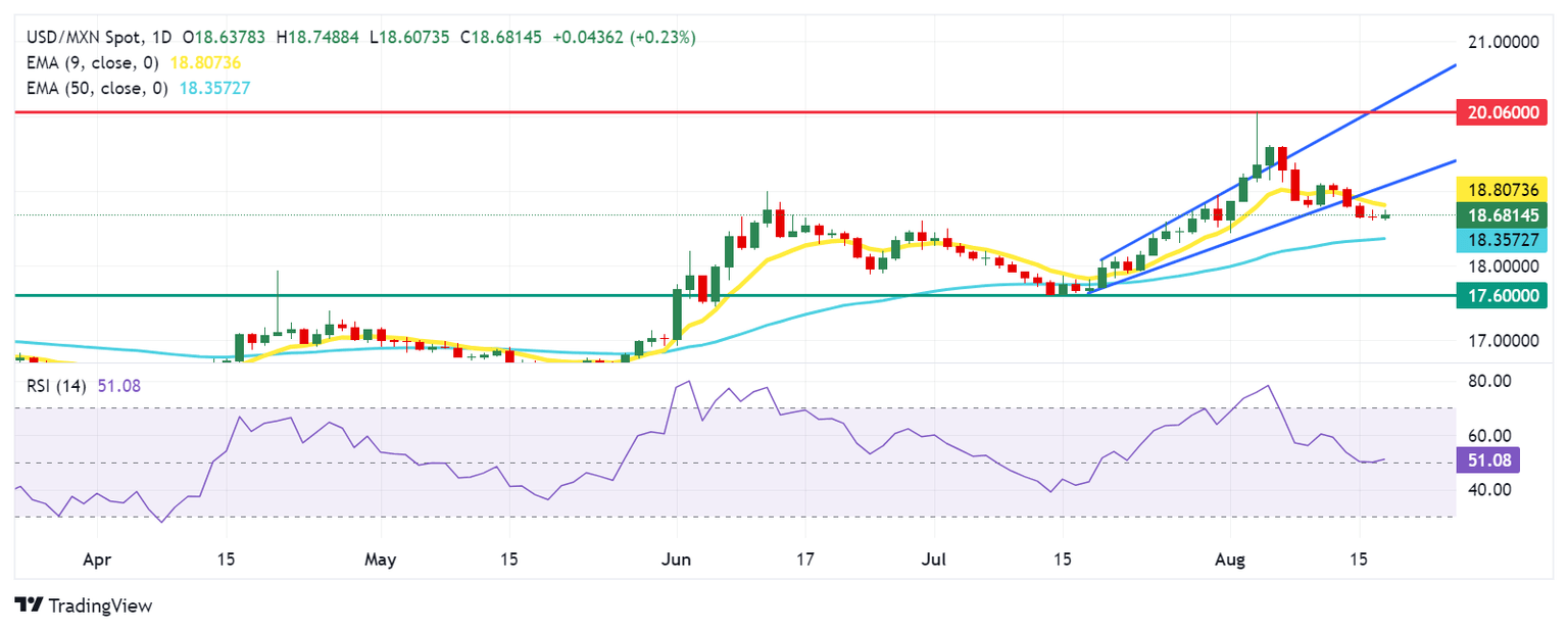 - USD/MXN price tests the nine-day EMA at the 18.81 level, followed by the lower boundary of the channel.