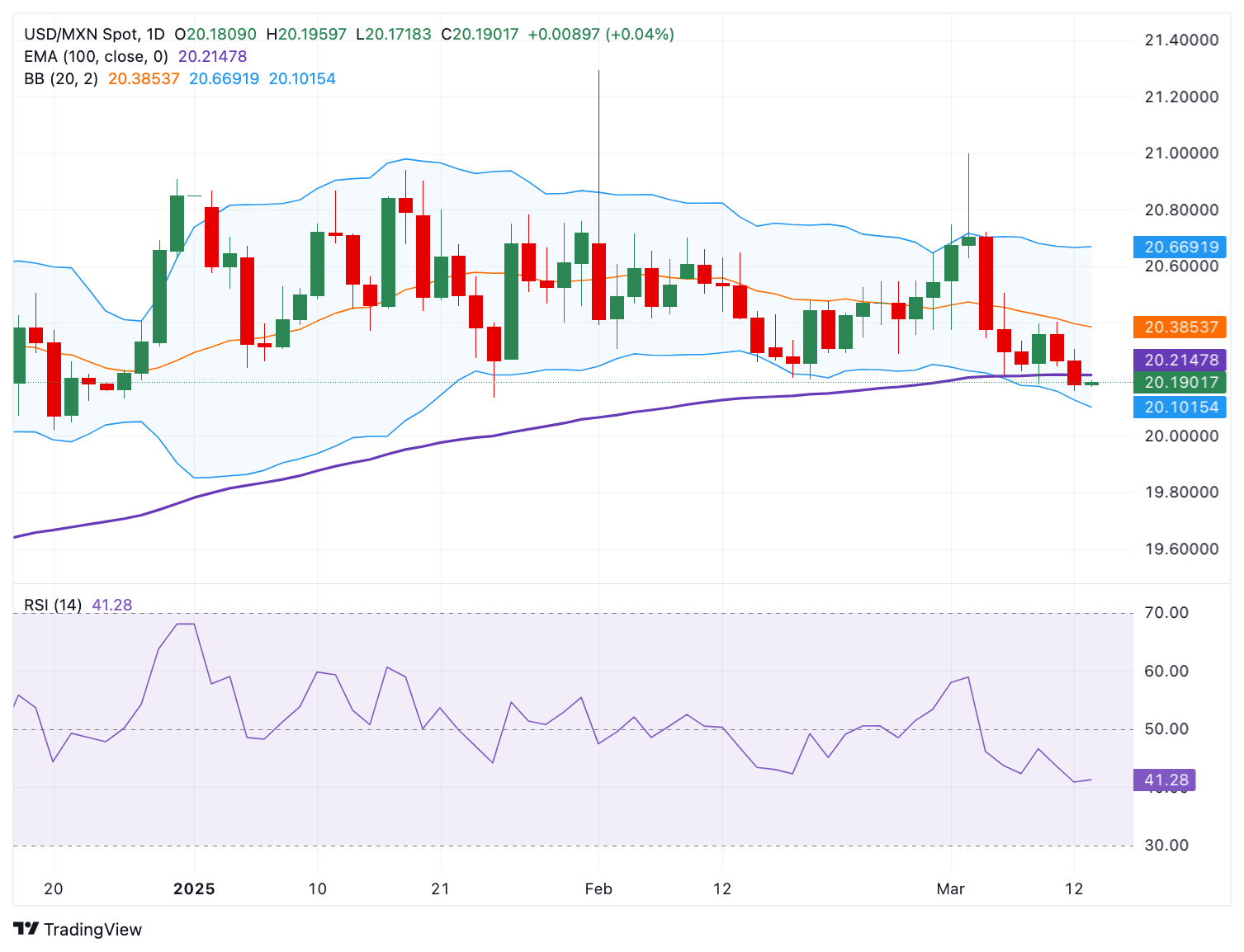 The initial support level for USD/MXN emerges at the 20.10-20.00 zone, representing the lower limit of the Bollinger Band and the psychological level. A breach of this level could expose 19.25, the low of October 11, 2024. Extended losses could push prices lower toward 18.60, the low of October 16, 2024.