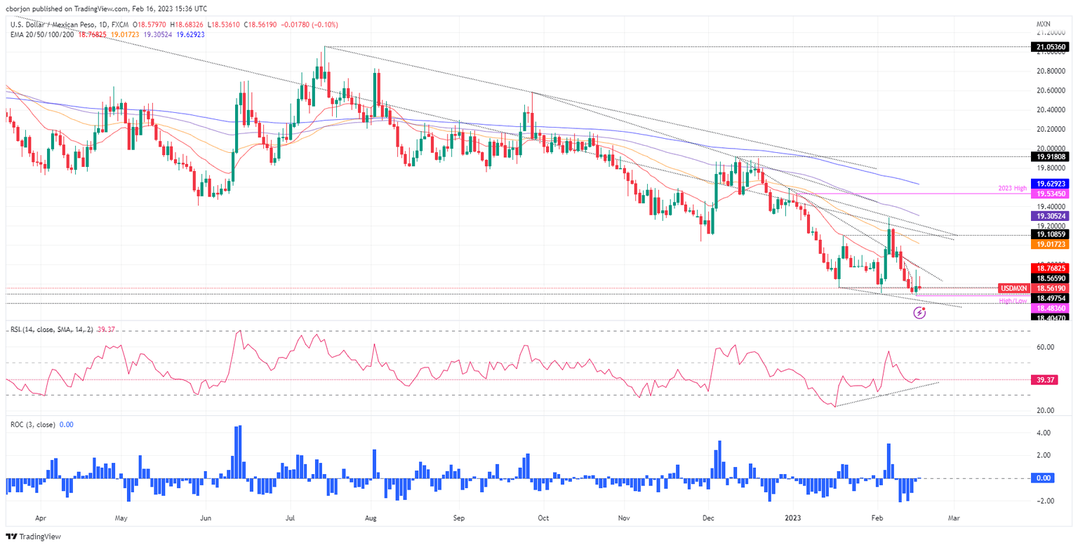 From a technical perspective, the USD/MXN remains neutral-downward biased. Still, the positive divergence between the Relative Strength Index (RSI) and price action is looming, meaning that prices could move higher. For a bearish continuation, the USD/MXN needs to break below the YTD low at 18.4836, so it can test the psychological $18.00. On the other hand, if the USD/MXN reclaims the 20-day EMA at 18.7714, the USD/MXN would be poised to challenge $19.00.