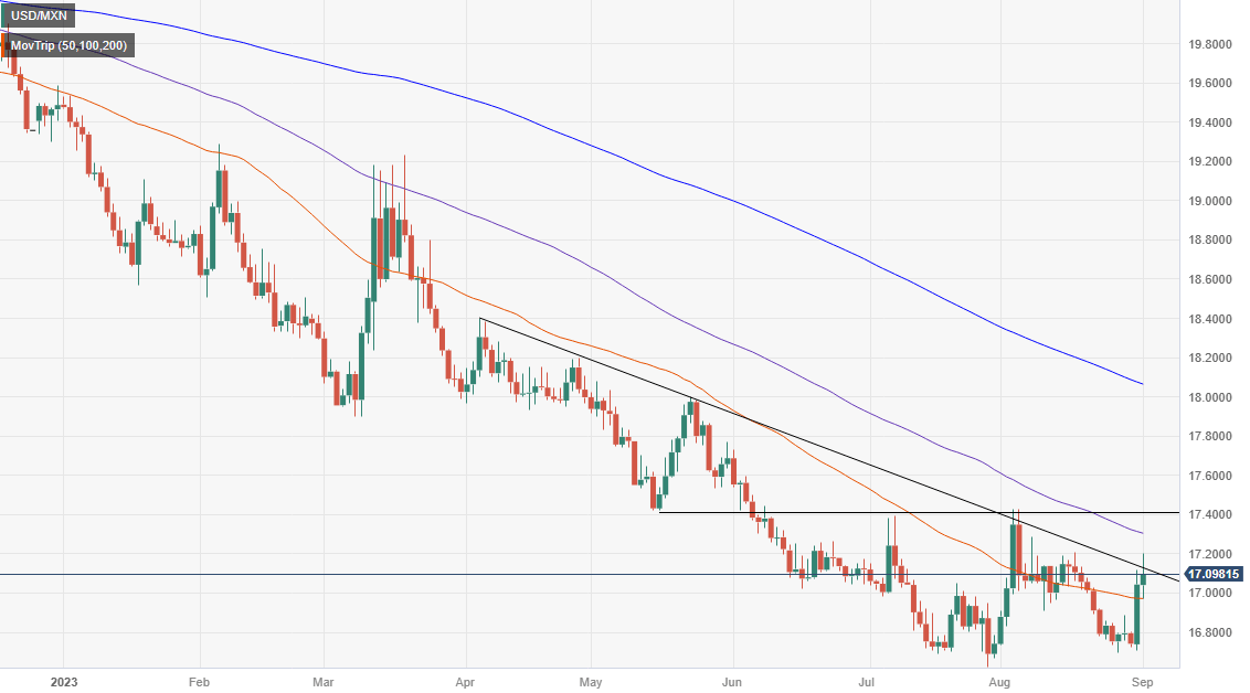 From a technical standpoint, the USD/MXN has broken to the upside, set to register its most significant weekly gain of more than 2.40%. Buyers are eyeing a break of a downslope resistance trendline drawn from April 2023 highs of 18.4010, which, once cleared, could put the May 17 swing low of 17.4038 as crucial resistance. A breach of the latter would put a challenge of the 18.0000 figure into the table.