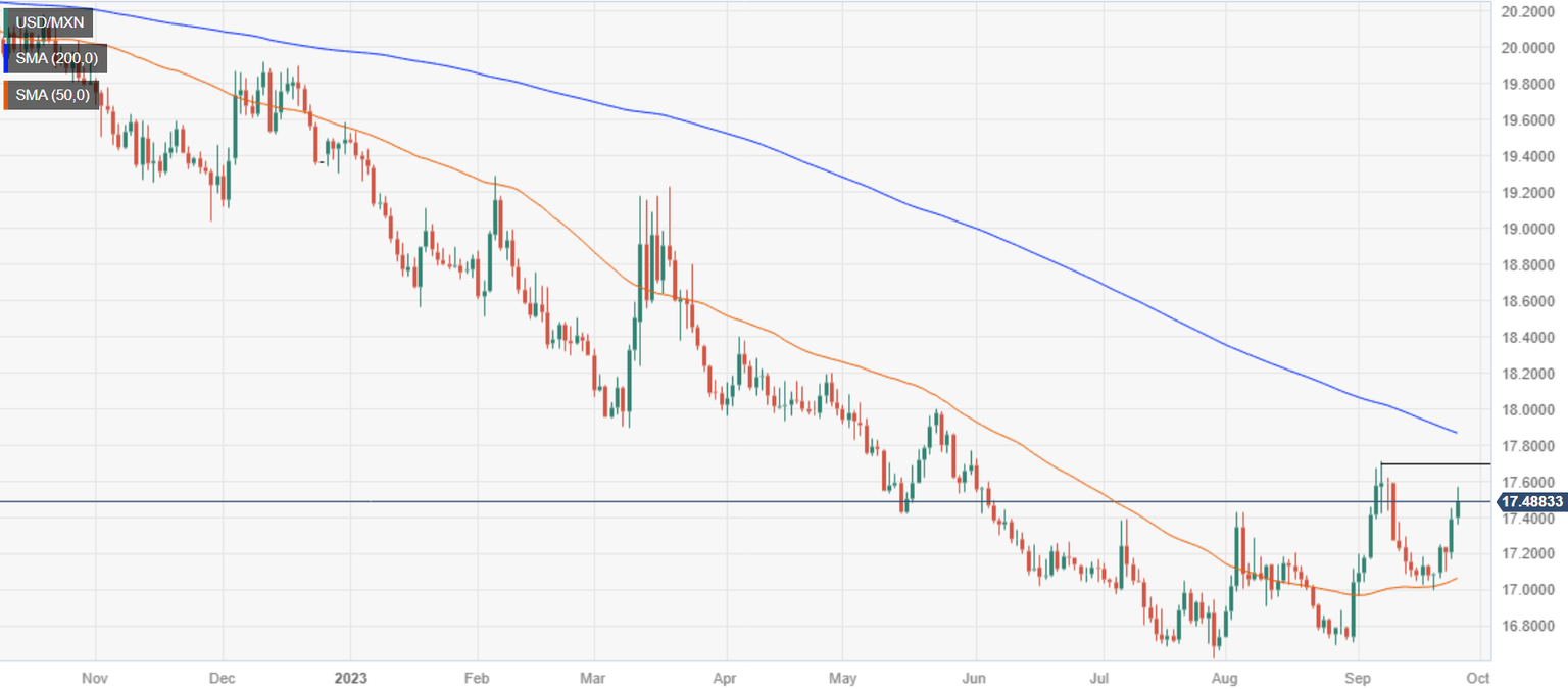 The USD/MXN resumed its uptrend after the US Federal Reserve (Fed), despite holding rates unchanged, delivered a hawkish hold, as revealed by the “dot-plots” in the Summary of Economic Projections. Fed officials foresee rates at 5.6% in 2023 and 5.1% in 2024, higher than the 4.6% projected in June 2023.
