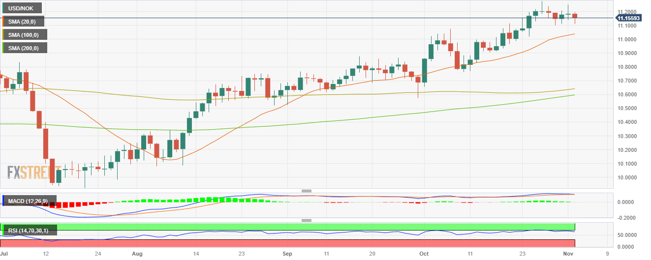 - USD/NOK jumped from a low around 11.108 to 11.150, seeing mild losses.