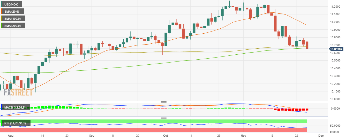 - The USD/NOK encounters a 0.50% downslide and trades around the 10.650 level, below the dual resistance of 200 and 100-day SMAs.