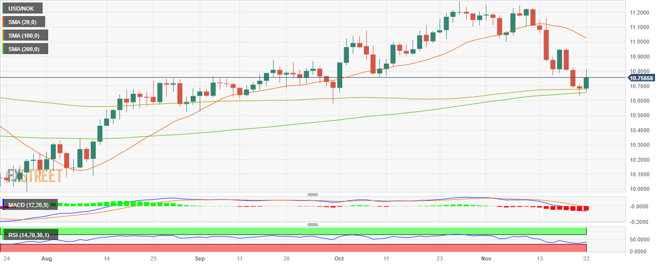 - The USD/NOK rallies 0.75% upwards, navigating near the 10.750 level.