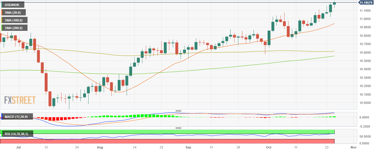 On Wednesday, the USD/NOK jumped to a daily high of around 11.215, its highest since May 31, and since last Friday, the pair has increased by more than 1%. Higher US treasury yields and firm economic activity figures from its local economy benefit the US Dollar over the NOK.